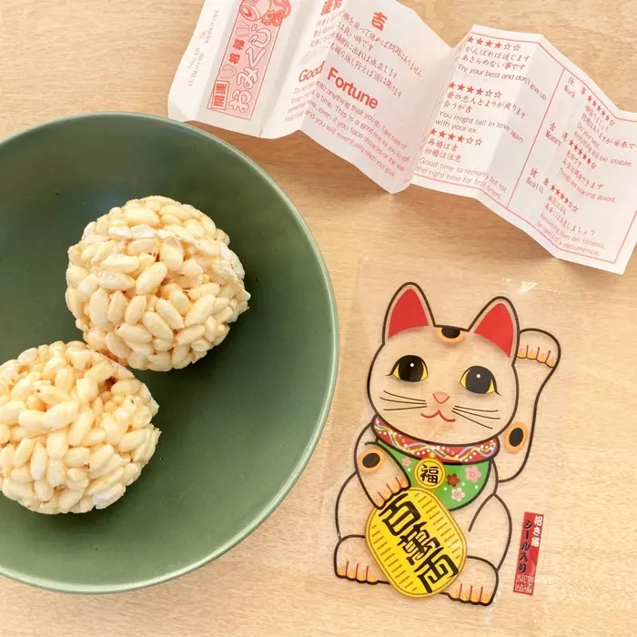 直径5cmほどの大きな丸いポン菓子が入ったお菓子。招き猫のシールが入っています。開運おみくじ付きで、なんと4か国語(日本語・英語・中国語・韓国語)対応!