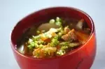 3、みそを溶き入れ、刻みネギを加え、再び煮立てば火を止める。