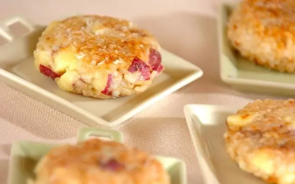 モチモチの玄米とサツマイモを使った素朴なおやつです。玄米ご飯をすりこ木で潰してから、丸く成形してフライパンで焼きます。玄米の香ばしさとサツマイモの甘さが見事にマッチした絶品です。少量加える味噌の塩気もアクセントに。よく噛んで、素材の味を楽しみながら食べてくださいね。