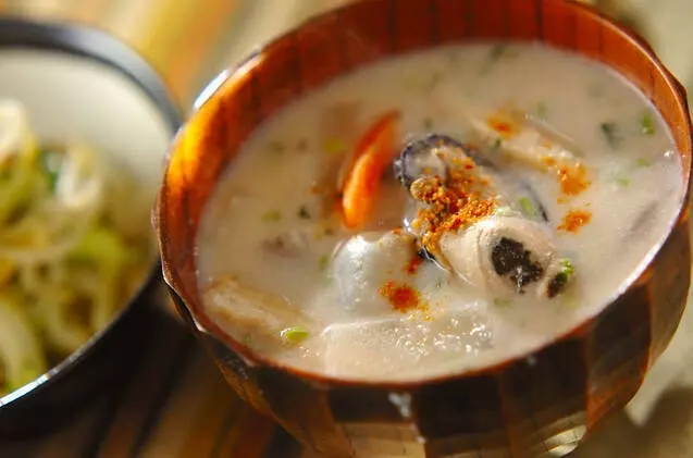 具沢山の贅沢な粕汁。カキの旨味が加わって、和風クラムチャウダーのようなクリーミーな味わい。発酵食品の酒粕は体を芯からポカポカにしてくれます。寒い季節にオススメの栄養価の高い一皿です。