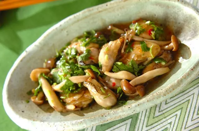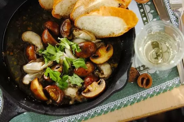お店の味が再現できるカキのアヒージョ。カキとマッシュルームの旨味が溢れたオイルにパンを浸せばワインに合う一品が完成です。おもてなしにも喜ばれますね。