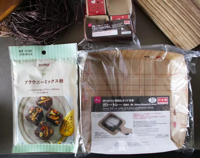 「ブラウニーミックス粉 」108円(税込)とダイソー新商品の「ガトートレー」(15x15xh3.5、1枚入り)110円(税込)上に見えるのは3.2cm角の小さなトレー(8枚入り)