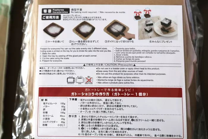 ダイソー新商品の「ガトートレー」(15x15xh3.5、一枚入り)110円(税込)の裏面の説明書き