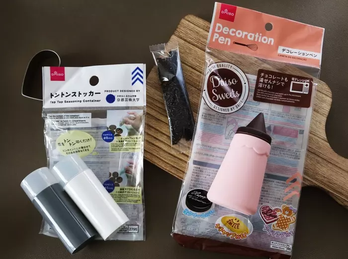 「トントンストッカー」(写真左)は、チョコスプレーやアラザンを入れて底をトントン叩けばピンポイントに少量出せて、そのまま保存もできる便利グッズ。出しやすい上に、使い切れない分がバラバラになったりせず保存できます。穴のサイズの違うチョコスプレー用(8ミリ)と食紅やアラザン用(5ミリ)が2種類入って110円(税込)。