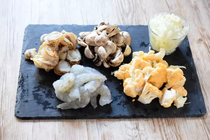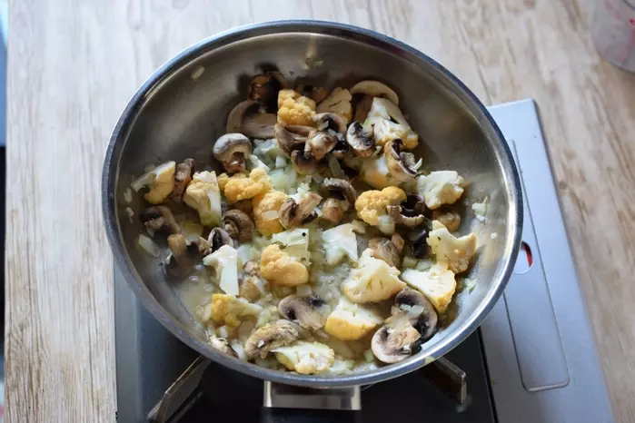 3、マッシュルームとカリフラワーを入れ、炒め合わせたら、分量の水を入れる。蓋をしてカリフラワーが柔らかくなるまで蒸し煮にする。