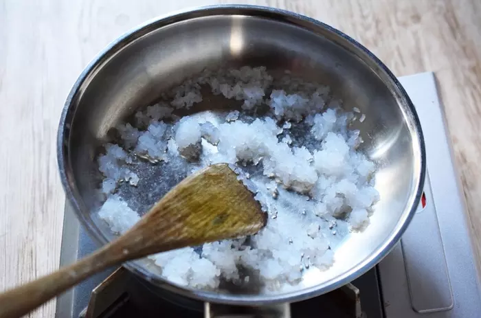 1、しらたきは、米粒状にみじん切りにし、フライパンで乾煎りして水分を飛ばす。炊飯器に洗った米1合分と、1合分の水を入れ、しらたきを加えて炊飯する。