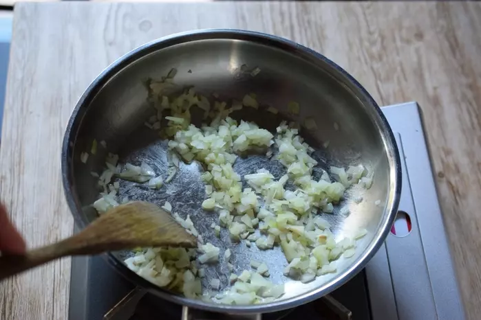 2、フライパンにオリーブ油を熱し、玉ネギとニンニクを入れて透き通るまで炒める。