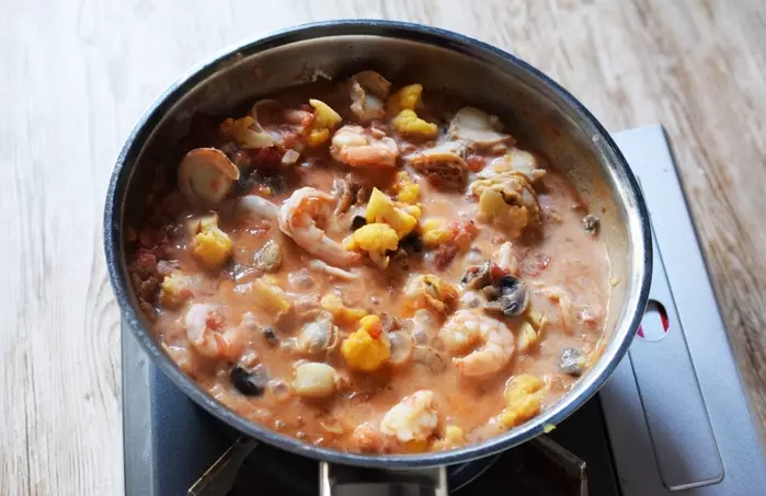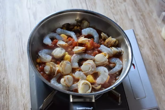 4、トマト水煮を入れて、つぶしながら沸騰するまで煮る。エビとベビーホタテを入れて色が変わるまで混ぜながら煮る。※注:煮すぎると固くなるので、注意。