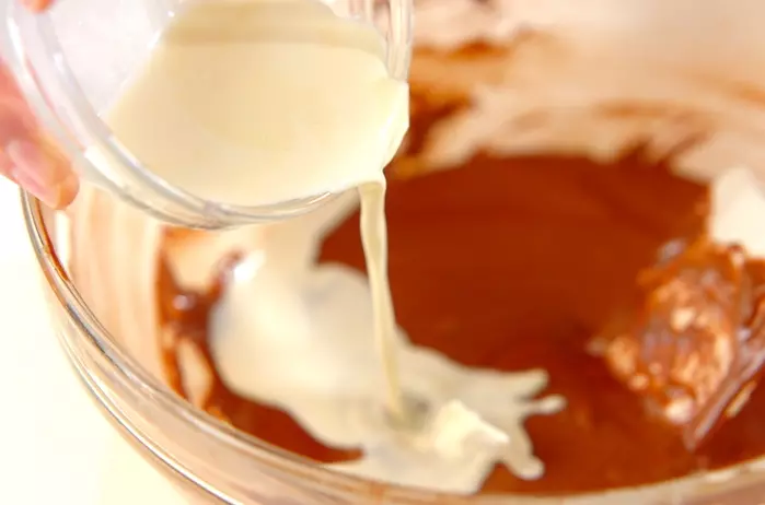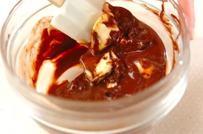 1、ボウルに細かく刻んだクーベルチュールチョコ、無塩バターを入れ、湯煎で溶かして40℃ぐらいに温めておく。