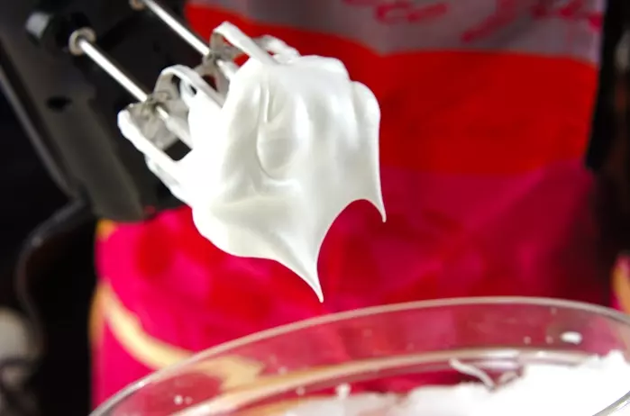 4、別のボウルに卵白を入れ、グラニュー糖70gを2~3回に分けて加え、しっかりしたメレンゲを作る。