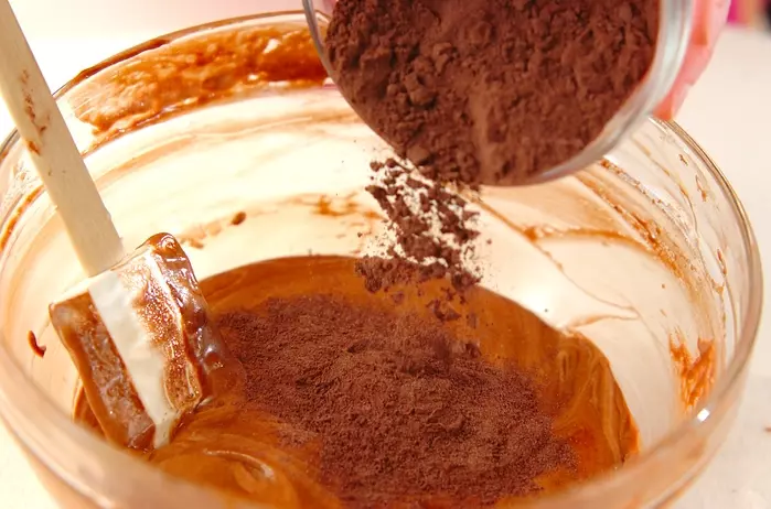 5、(3)に(4)のメレンゲの1/3量を加えて混ぜ、さらに合わせて振るった薄力粉とココアパウダーを加え、混ぜ合わせる。最後に残りのメレンゲを加え、混ぜ合わせる。