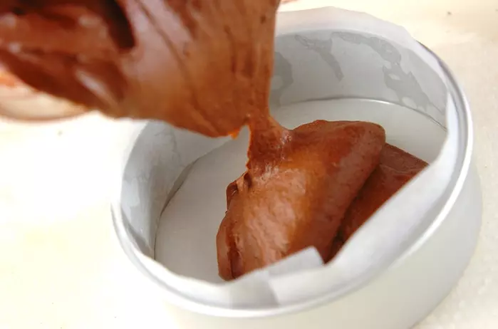 6、敷き紙を敷いた型に生地を流し入れ、170℃に予熱しておいたオーブンで20分、さらに160℃に下げて20分焼く。