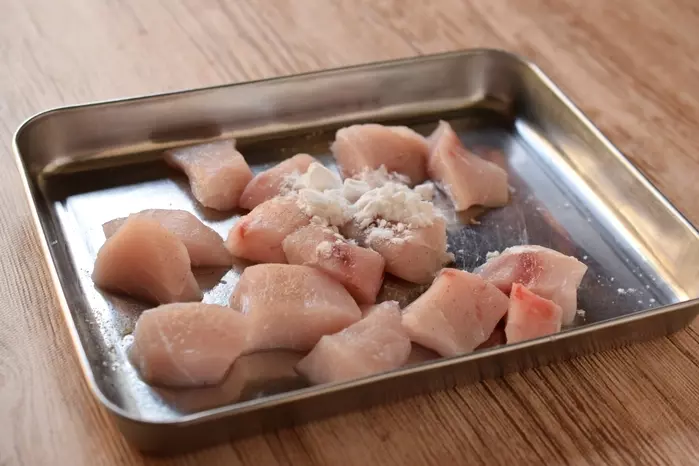 1、メカジキに塩、コショウをまぶし、しょうが汁をかけ、もみこむ。全体に片栗粉をまぶし、余分な粉をはたく。