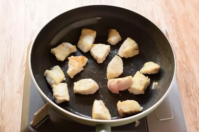 ・メカジキは表面の水分をキッチンペーパーでふきとり、食べやすい大きさに切る