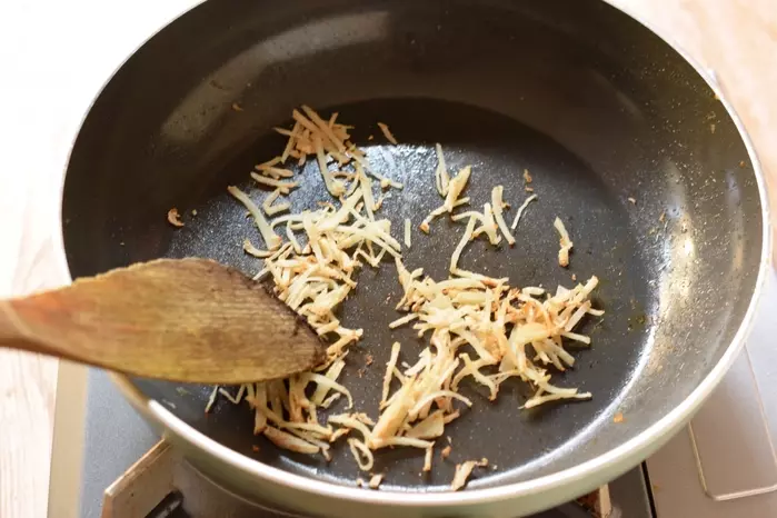 3、(2)をいったん取り出し、オリーブ油小さじ1を入れ、中火でショウガの千切りを入れて炒める。
