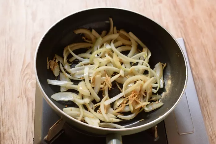 4、玉ネギを入れて、玉ネギが透き通るまで炒める。