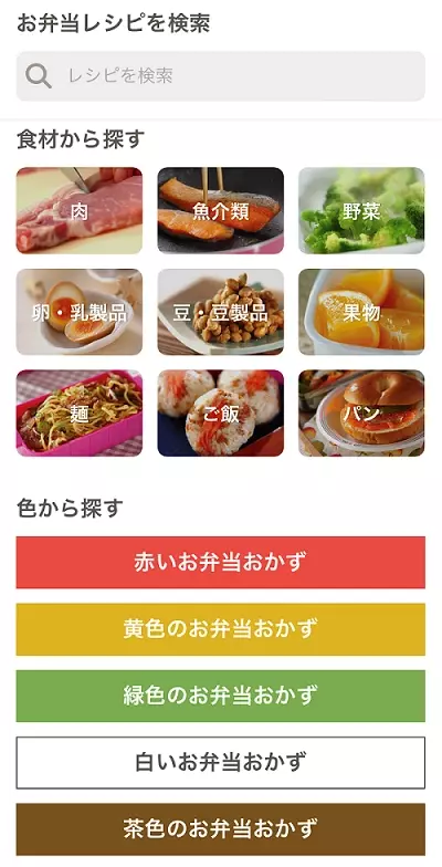 毎日のお弁当提案や、お弁当のおかずに特化したお弁当検索(※)など、日々のお弁当作りにとっても便利。食材から検索するのはもちろん、食材の色からおかずを探す(※)ことも可能ですよ。ぜひ使ってみてくださいね。