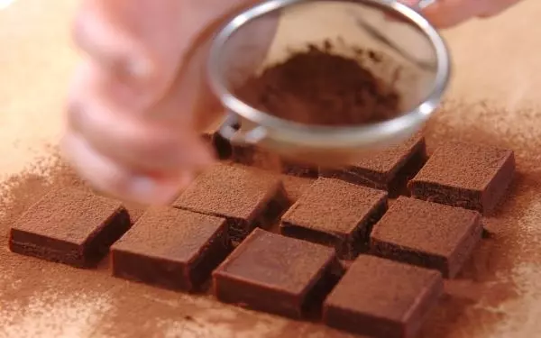 6、(5)の生チョコをセルクルから外し3cm角にカットして、ココアをまぶす。