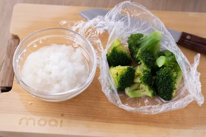 ブロッコリーは小房に分けてラップで包みレンジで600Wで3分加熱する。大根は皮をむきすりおろす。