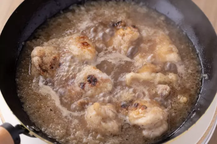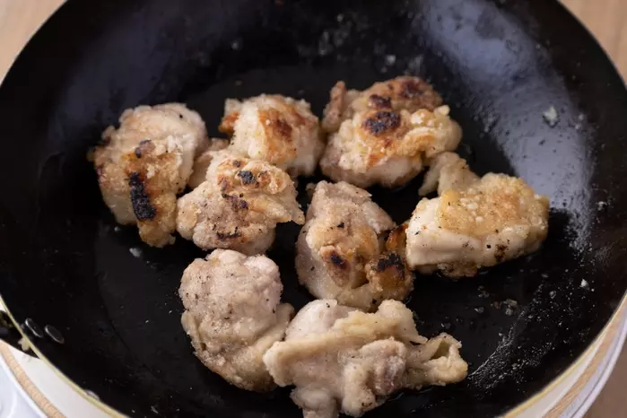 1、袋に鶏もも肉、片栗粉を入れ揉みこむ。フライパンでサラダ油を中火で熱し、鶏もも肉を焼き色がつくまで炒める。