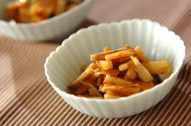 食べやすくカットしたレンコンに、バター、砂糖、ハチミツ、しょうゆの甘いタレを絡めます。大学いもとはまた違う、シャキシャキした食感が楽しめます。お子さんのおやつや小腹が空いて甘いものが欲しい時にいかがですか?