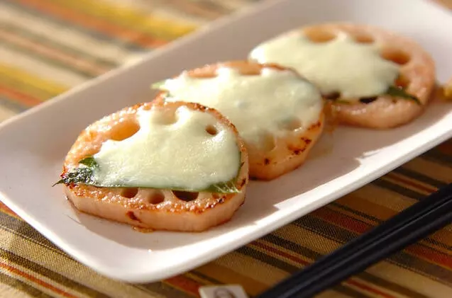 シャキシャキ食感のレンコンに、モッツァレラチースを乗せて焼きました。間に挟んだ大葉がポイントです。チーズをゴルゴンゾーラに変えて、ハチミツをかけて食べる、マリアージュアレンジもできる一品です。