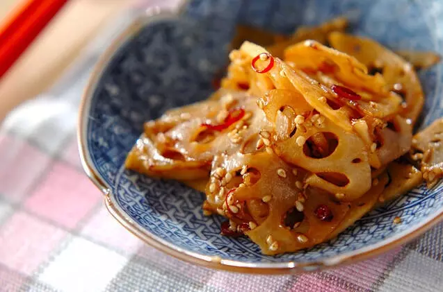 フライパンで焼き色をつけたレンコンを調味液に漬けて味を染み込ませた一品は、炒めた際に使った胡麻油の香りが香ばしくお箸が進みます。お酒のおつまみや、あと一品欲しい時にオススメです。