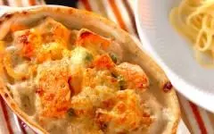 ショウガをたっぷり添えて食べる、大根と豚バラの煮物です。香り良くさっぱりとしています。柔らかい大根と豚バラの旨味が見事にマッチ。食材に味がしっかりしみ込んで、美味です。豚バラ肉の臭みと脂が気になる場合は、サッと湯通ししてください。和食とグラタンのコラボも良いものですね。