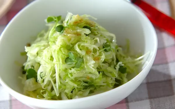 せん切りにしたキャベツにユズドレッシングをかけたサラダです。香り豊かで、後を引きます。さっぱりとしているため、濃厚なグラタンとの相性も抜群です。貝割れ菜をキュウリやニンジンに代えてもOK。ちょっと具材にアレンジを加えるだけで、風味を絶妙に変えられます。