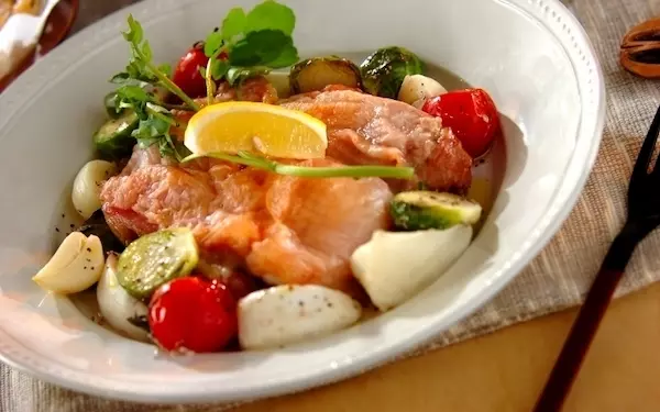 グラタンと同じくらいのメインをもう一品用意したいときにオススメなのがこちらのレシピ。色鮮やかな野菜を鶏肉で蒸し焼きにします。切った野菜を敷き、鶏もも肉の皮面を上にして覆うようにしてのせ、オーブンで焼けばOKです。仕上げに、粗びきコショウとEVオリーブ油をかけ、レモンとクレソンを添えましょう。ホームパーティーにも最適な華のある一品です。