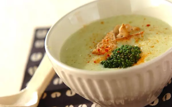 ブロッコリーとジャガイモ、白ネギを使った野菜たっぷりのスープです。スープをミキサーにかけるとき、熱すぎる場合は粗熱をとってからミキサーにかけることをおすすめします。野菜の旨味がギッシリ詰まっていて、コクがある一杯です。グラタンとも好相性!