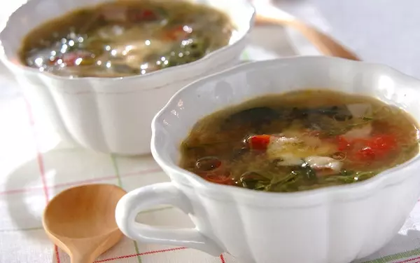 和と洋が融合したみそ汁です。水菜、ベーコン、ミニトマトを使って作ります。器によそってから、オリーブ油をかけ、粉チーズを振るのがポイント。風味が良く、食欲をそそられますよ。サラサラとした舌触りで食べやすいのも魅力です。ご飯にかけて食べても美味。ぜひお試しください。