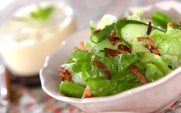 アスパラとベーコンが入ったサラダ。レタスのシャキシャキ食感とベーコンのカリカリ食感が美味しいハーモニーを奏でてくれます。ベーコンは細切りにし、フライパンでカリカリになるまで炒めてくださいね。ドレッシングのボウルに野菜を入れ、全体にからめてから器に盛りつけて、ベーコンを散らしましょう。
