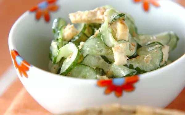 キュウリと油揚げのマヨ和えです。適度な酸味とゴマの香りがやみつきになります。お好みで、カニ風味カマボコやちくわを加えても美味しいです。パパッと手軽に作れるので、「もう一品ほしい!」と思ったときにピッタリ。この副菜を追加するだけで、食卓が賑やかになりますよ。