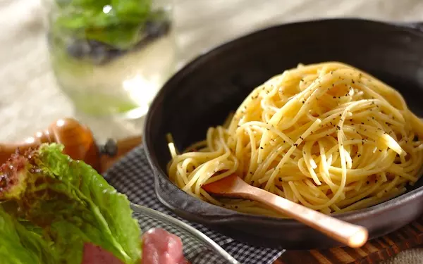 洋食のメイン料理の付け合わせとして大活躍する黒コショウとバターのパスタ。固形スープの素を入れてスパゲティーを茹で、バター、粗びき黒コショウを加えて、塩で味を整えれば完成です。10分で作れるため、時間がないときにもピッタリ。グラタンと一緒に盛りつけても良さそうですね。