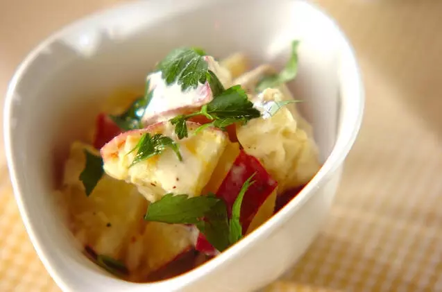 皮付きのまま、いちょう切りにしたサツマイモを10分程度茹で、ヨーグルトドレッシングと和えました。サツマイモの優しい甘さとヨーグルトの酸味がよく合います。食物繊維たっぷりのサツマイモと、発酵食品のヨーグルトを合わせた美腸になれるサラダです。