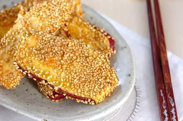 サツマイモにたっぷりのゴマをまぶして揚げた一品は、香ばしくて美味。揚げる時は150℃くらい、少し低めの温度でサックリ揚げましょう。
