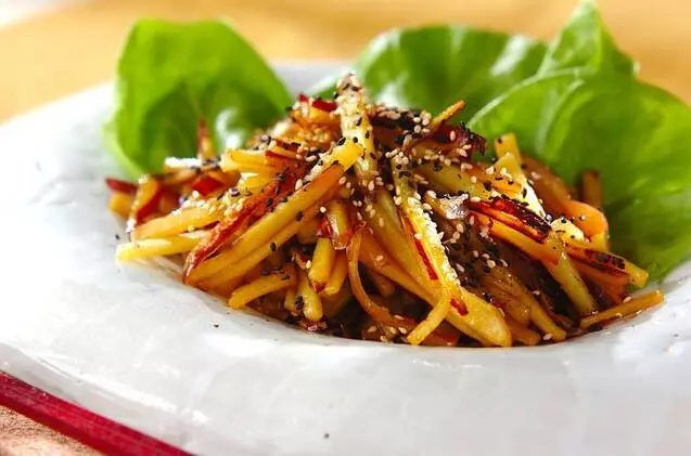 サバの塩焼きやカレイの煮付けなどの魚料理の副菜には、少しパンチの効いた副菜がベストです。そんな時はコレに決定。サツマイモを細切りにし、みそとバターで炒めた一品は、食べ応えがあり、バターとみそで奥行きのある味わいに。腹持ちも良くお酒のおつまみにも。間違いなしの一品です。
