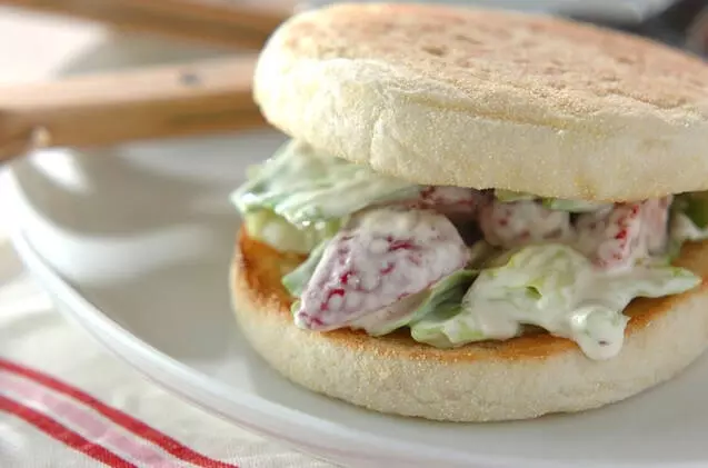 お食事系にもスイーツ系にもなるイチゴ入りのクリームサンド。春キャベツの代わりに芽キャベツを使っても◎。