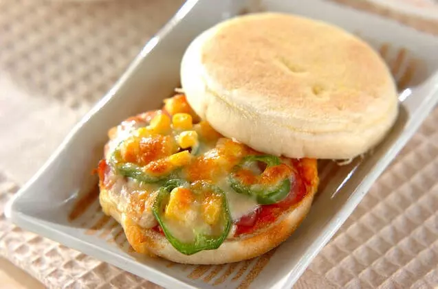 イングリッシュマフィンを半分に割ってピザソースととろけるチーズにお好みの具材でアレンジしたピザ朝ごはんにいかがですか?