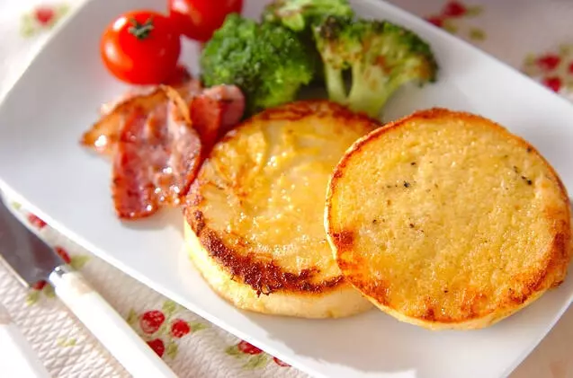 粉チーズ入りの卵液にマフィンをひたして作ったフレンチトーストは、カリッと食感で中はもっちり。こんがり焼いたベーコンやサラダと一緒にワンプレートに盛り付けたら、おしゃれモーニングが完成します。
