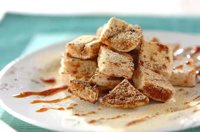 イングリッシュマフィンを一口大に切ってフライパンでカリッと焼き、きな粉と黒みつをかけた和デザート。おいしく作るコツは弱火で黒砂糖をゆっくり溶かすこと。カリッと食感であとを引く美味しさです。