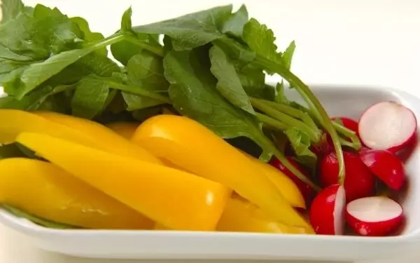 ・黄パプリカはヘタと種を除き、キュウリに合わせて切る。ラディッシュは葉つきのまま半分に切る。