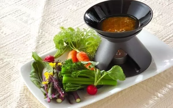 3、器に野菜を盛り合わせ、<バーニャカウダソース>を添える。
