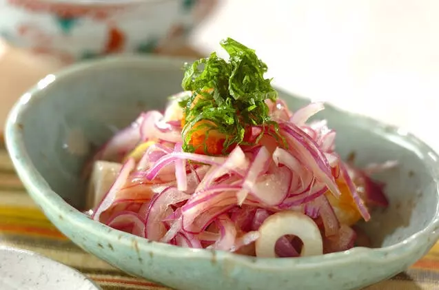塩でもんだ紫玉ネギとちくわの、サッパリとした酢の物です。箸休めに最適です。ごま油が入っているので、酸味の中に香ばしさも感じられます。