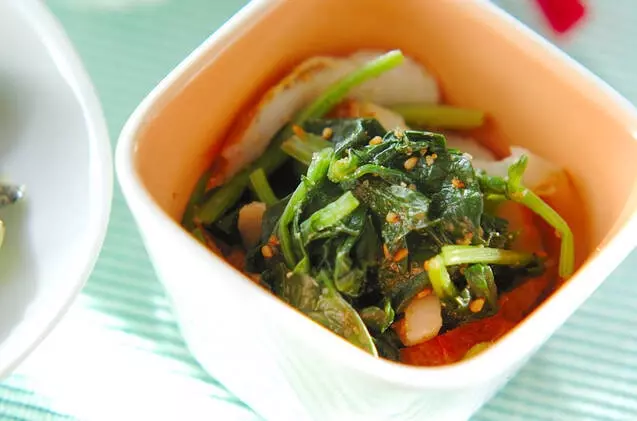 ホウレン草とちくわのごま和えです。ホウレン草はサッとゆでるのがポイント。さっぱりとした副菜なので、どんな献立にも合いそうです。お弁当に入れても。