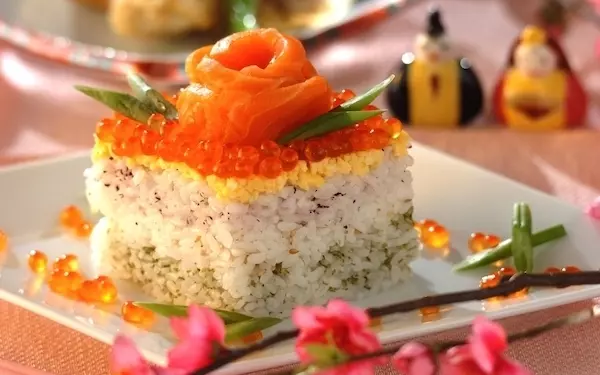 ひし餅をイメージした三色の酢飯を土台に、サーモンやイクラをデコレーションして豪華に。酢飯もゆかり、白ゴマ、青のりをまぶした3つの層に分けるため、見た目がキレイです。サーモンは1切れを端からくるくると巻き芯を作り、周りにもう1~2枚を巻いて花びらの形にするのがポイント。この一手間でより華やかになります。