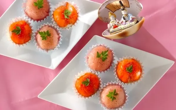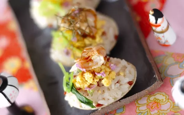 ハマグリの殻に寿司飯をつめ、ハマグリの身、刻みのり、穂じそをトッピングしたオシャレな一品です。今年のひな祭りは、このお寿司とハマグリの吸い物を作って、ハマグリ尽くしにしてもいいかもしれませんね。やや手間がかかりますが、その分、出来上がったときの感動はひとしおです。