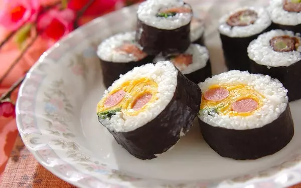 棒卵焼き、牛肉巻き、タラコとミツバの3種類の巻き寿司を楽しめます。棒卵焼きにはソーセージ、牛肉巻きにはグリーンアスパラをプラス。ボリュームもあり、なかなかの食べ応えです。3種類の巻き寿司をひとつのお皿に盛り合わせれば、より美しい見た目に。持ち寄りやおもてなしにも良さそうです。