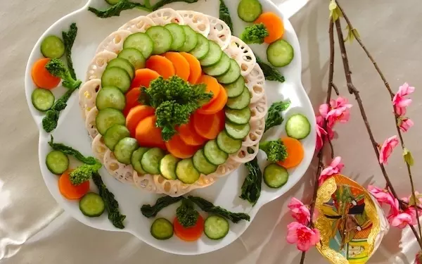 魚介類が食べられなかったり、ヘルシーな食事にしたい場合は、こちらの野菜ケーキ寿司を試してみませんか? 野菜としば漬けで彩り良くデコレーションします。レンコンを外側に並べ、次に真ん中にニンジンを重ね合わせるようにのせ、最後にキュウリを埋めるように並べるのがコツ。そうすることで、キレイに仕上がります。